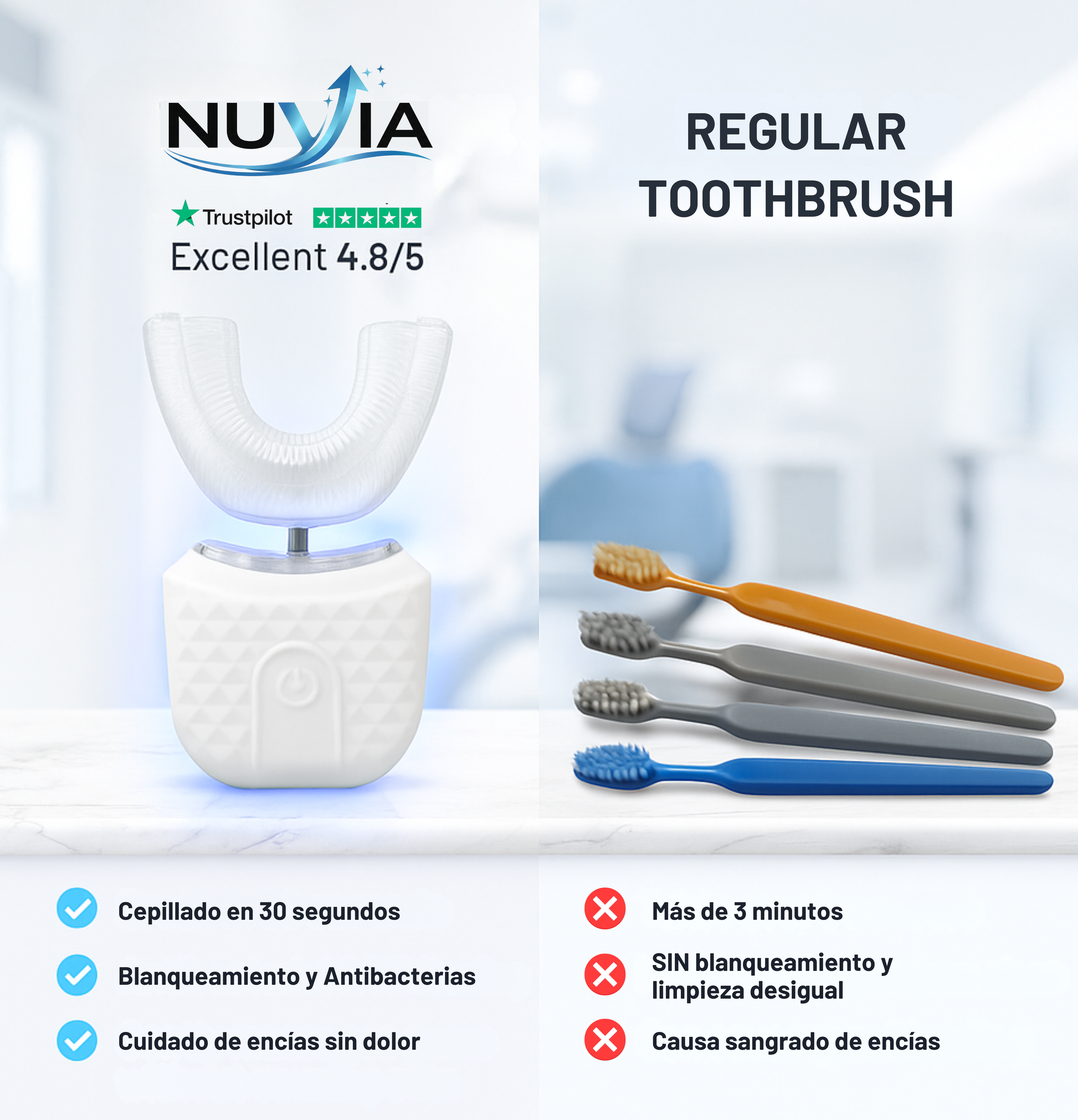 Sí, es 100% seguro. Nuvia One Pro utiliza una tecnología que no daña la estructura del diente ni las encías, cumpliendo con los estándares de seguridad dental más exigentes.